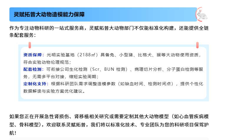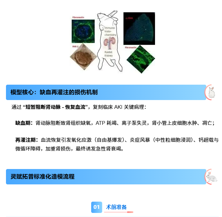 急性肾损伤(AKI)基础研究与临床转化中,兔子肾缺血再灌注损伤(IRI)模型是还原临床病理的 “黄金工具”。灵赋拓普大动物团队依托标准化技术流程精准构建该模型,为科研提供可靠支撑。