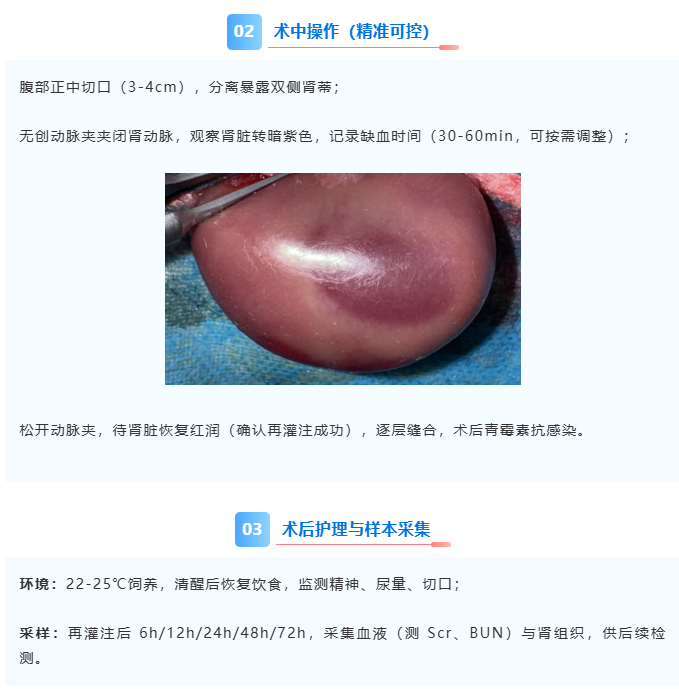 • 严格控制缺血时间:过短则损伤较轻,模型不成立;过长则导致肾脏不可逆坏死,无法观察再灌注损伤;