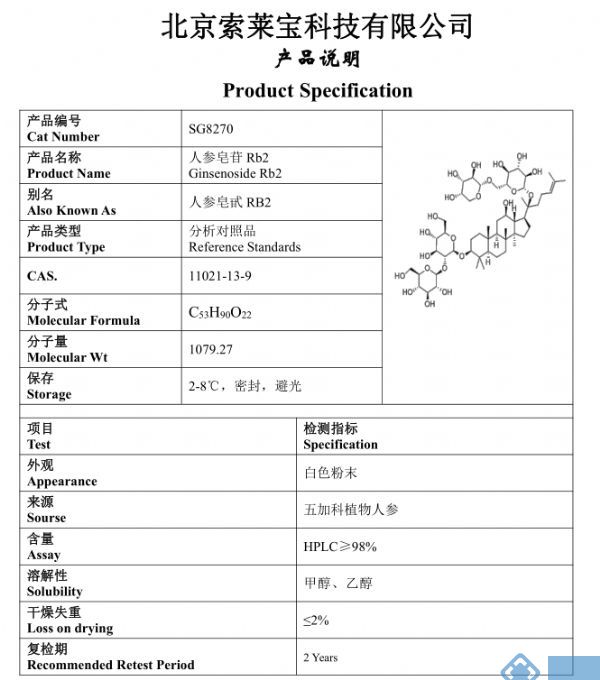 产品名称: Ginsenoside Rb2;人参皂苷Rb2